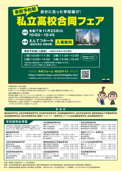 11月23日(日)に、静岡県西部の私立高校11校が参加する「私立高校合同フェア」を行います。