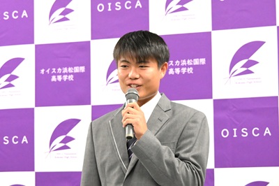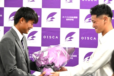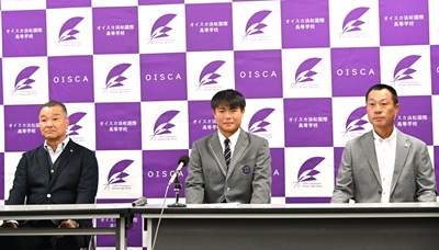 指名を受けて大橋さんは、「野球をやり始めた小学校からの夢が叶いました。まずは、自分を支えてくれた家族、そしてこのオイスカ高校野球部 永井監督をはじめ、いっしょに野球をやってきたチームのみんなに感謝したいです。これからは、毎日努力してプロに入り、多くの人に自分のプレーで感動してもらえるような選手になりたいと思います。今日はありがとうございました」と、感謝と決意を述べました。