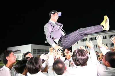 校庭でソフトバンクのキャップをかぶり、部員の胴上げを受けた大橋。「練習も自主練も一緒にしてくれた。感謝したい」。気恥ずかしそうな様子だったが、まっすぐに仲間への思いを語った。(細江支局・真田翼)
