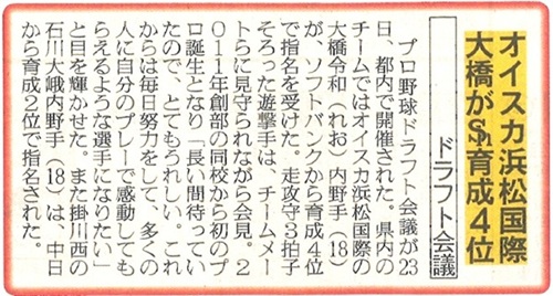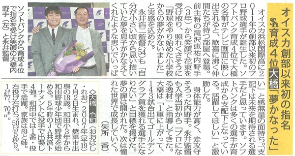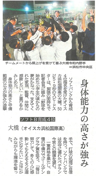 オイスカ浜松国際高に2011年の創部以来初のプロ野球選手が誕生した。ソフトバンク育成4位で大橋の名前がテレビ画面に映しだされると、歓喜に沸く仲間たちが待つ部屋へ登場。前主将の滝沢さん内野手(3年)から笑顔で花束を受け取り、照れくさそうに「野球をやり始めた小学校からの夢がかないました」と実感を込めた。