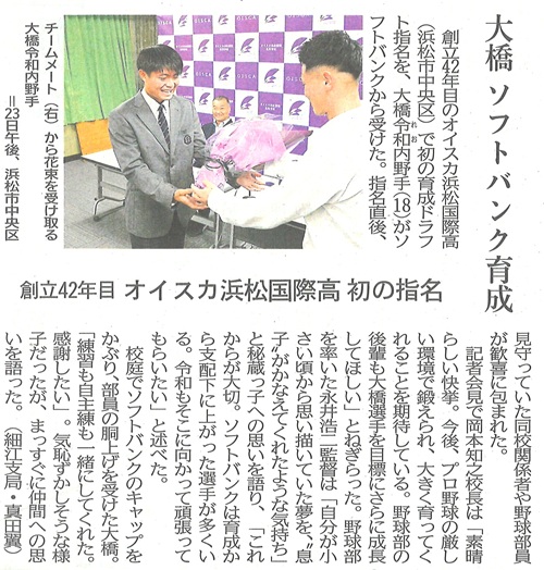 創立42年目のオイスカ浜松国際高(浜松市中央区)で初の育成ドラフト指名を、大橋令和(れお)内野手(18)がソフトバンクから受けた。
