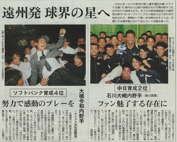 23日にあったプロ野球の新人選手選択会議(ドラフト会議)で、県内からは掛川西高校の石川大峨内野手(18)が中日から育成2位で、オイスカ浜松国際高の大橋令和内野手がソフトバンクから育成4位でそれぞれ指名された。夢舞台への第一歩を踏み出す2人は、目標とする選手像に向けて歩んでいく決意を語った。