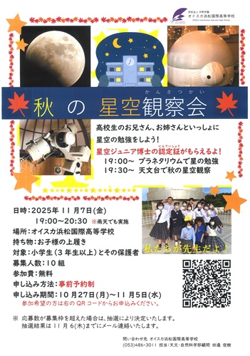 本校の天文・自然科学部が、小学生(3年生以上)とその保護者を対象に「秋の星空観察会」を行います!