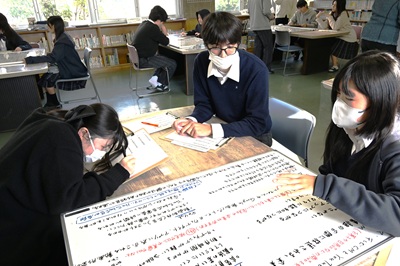 意見交換では、ホワイドボードや、丸いボードの上に丸く切った紙を引いた「えんたくん」使って意見を記録するなどし、生徒たちも和気あいあいと楽しく進めている様子でした。