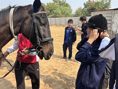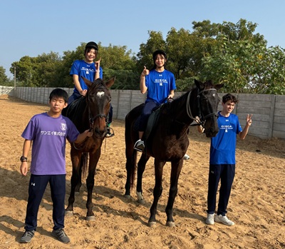 乗馬授業は、学校敷地内にある乗馬場で行いました。生徒たちはみな歓声を上げながら、全員が乗馬を体験することができました。その後、さらに園児との交流会にも参加しました。生徒たちは、英語で自己紹介をし、園児からの質問を受けたりして楽しい時間を過ごすことができました。