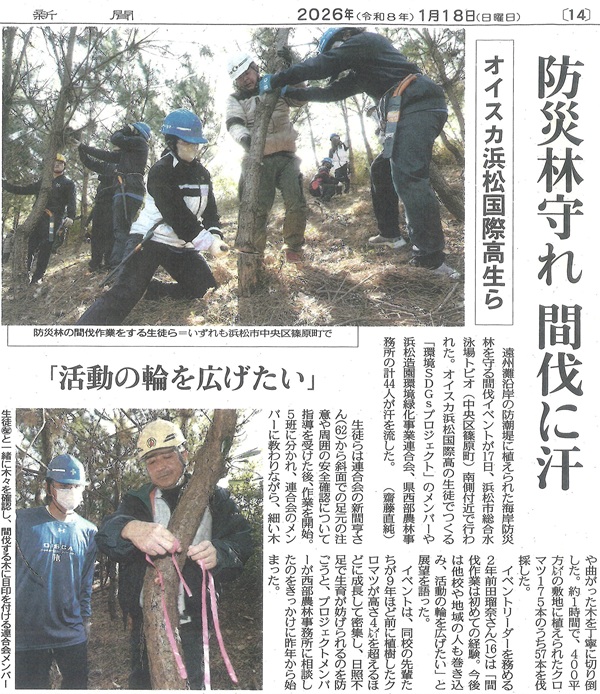 遠州灘沿岸の防潮堤に植えられた海岸防災林を守る間伐イベントが17日、浜松市総合水泳場トビオ(中央区篠原町)南側付近で行われた。オイスカ浜松国際高の生徒でつくる「環境SDGsプロジェクト」のメンバーや浜松造園環境緑化事業連合会、県西部農林事務所の計44人が汗を流した。(齋藤直純)
