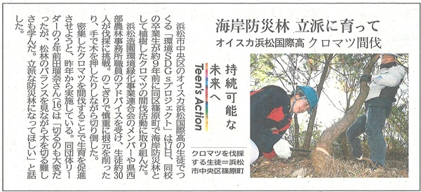 浜松市中央区のオイスカ浜松国際高の生徒でつくる「環境SDGsプロジェクト」は17日、同校の卒業生が約9年前に同区篠原町で海岸防災林として植樹したクロマツの間伐活動に取り組んだ。