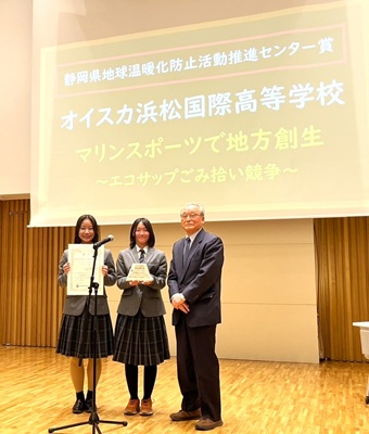 本校は、オイスカ環境SDGsプロジェクトの『マリンスポーツで地方創生~エコサップごみ拾い競争~』が、高等学校の部で【県教育長賞】、企業賞の部門で【静岡県地球温暖化防止活動推進センター賞】を受賞。また、インターアクト部の『眠っている食品を誰かの笑顔に フードドライブ』に【奨励賞】をいただきました。