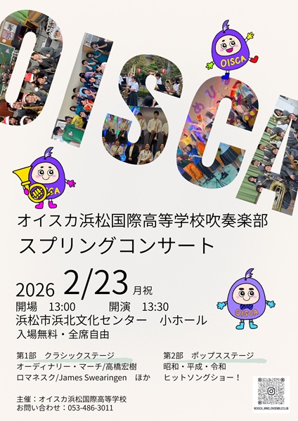 2月23日(月祝)、本校の吹奏楽部が主催する「スプリングコンサート」を浜松市浜北文化センターで開催します。