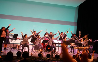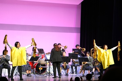 日本の春を象徴する名曲「花」(滝廉太郎作曲)を、吹奏楽の華やかな響きでアレンジした「花のプロセッショナル」でコンサートが開演。第1部のクラシックステージでは、この曲を含む4曲を演奏しました。難しい曲にも挑戦し、チームの心を1つにし、丁寧に演奏をすることができました。第2部のポップステージでは、昭和・平成・令和のヒットソング11曲を演奏。また、演出にもこだわり、3年生がキャラクターに扮してダンスを披露する場面があるなど、大いに盛り上がりました。