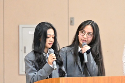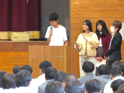 また、「日本の皆さんと友達になりたいです」「交流授業などで一緒に過ごすのが楽しみです」「忘れられない思い出をつくりたい」と日本語で話してくれました。一生懸命に伝えようとする姿に、生徒たちも深く聞き入っていました。