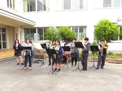 4月17日(金)、21日(火)の放課後、本校の昇降口前で、吹奏楽部による新入生歓迎「ウェルカムコンサート」を行いました。帰りのバスが出発するまでのわずかな時間ではありましたが、歓迎の気持ちを込めて2曲を演奏。 校舎に響く楽器の音色に、多くの生徒が足を止め、音楽を楽しむ素敵なひとときとなりました。