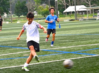 サッカー部は、全天候型グラウンドで練習。キラリと汗がひかります。