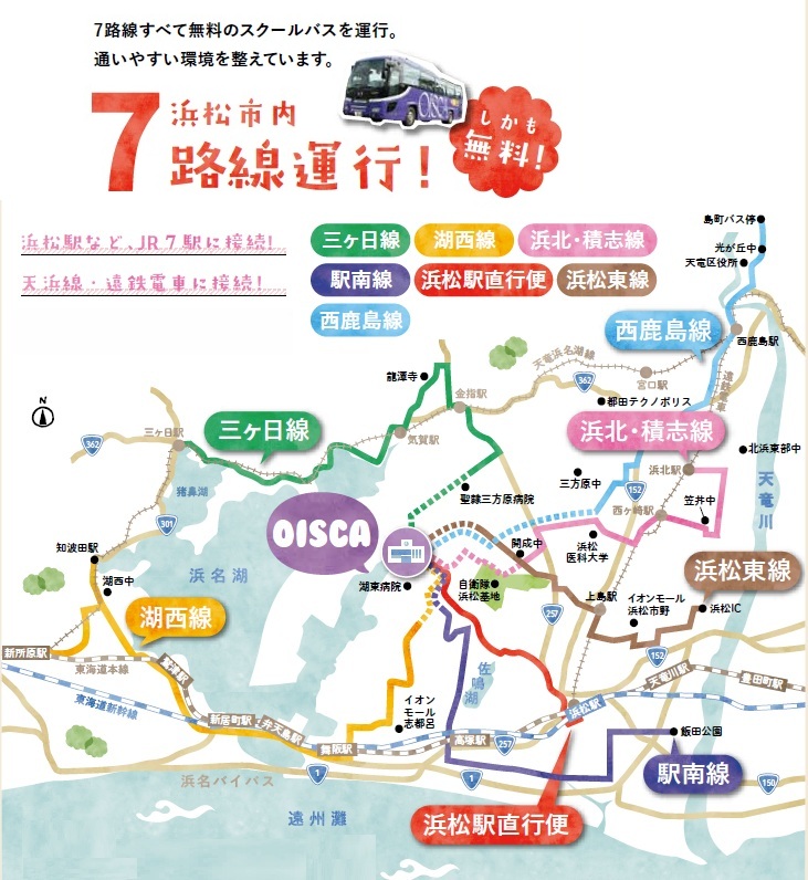 2025年度より、遠州鉄道 西鹿島駅から「西鹿島線」も開通し、全7路線でスクールバスを運行しています。